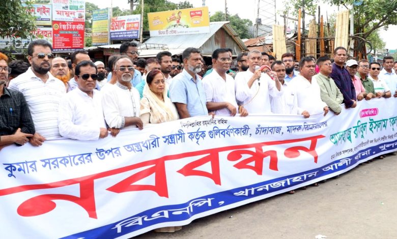 আজ মঙ্গলবার (২৪ জুন) বেলা দুইটায় তেলিগাতী মাধ্যমিক বিদ্যালয়ের ভারপ্রাপ্ত প্রধান শিক্ষক দীপক কুমার সরকারের ওপর গুলিবর্ষণকারী সন্ত্রাসীদের গ্রেফতারসহ অবৈধ অস্ত্রধারী, মাদক ব্যবসায়ী ও সেবনকারীদের গ্রেফতারের দাবিতে খানজাহান আলী থানা বিএনপির উদ্যোগে স্থানীয় ফুলবাড়িগেট বাসষ্ট্যান্ডে মানববন্ধন কর্মসুচিতে প্রধান অতিথির বক্তব্যে তিনি এসব কথা বলেন।